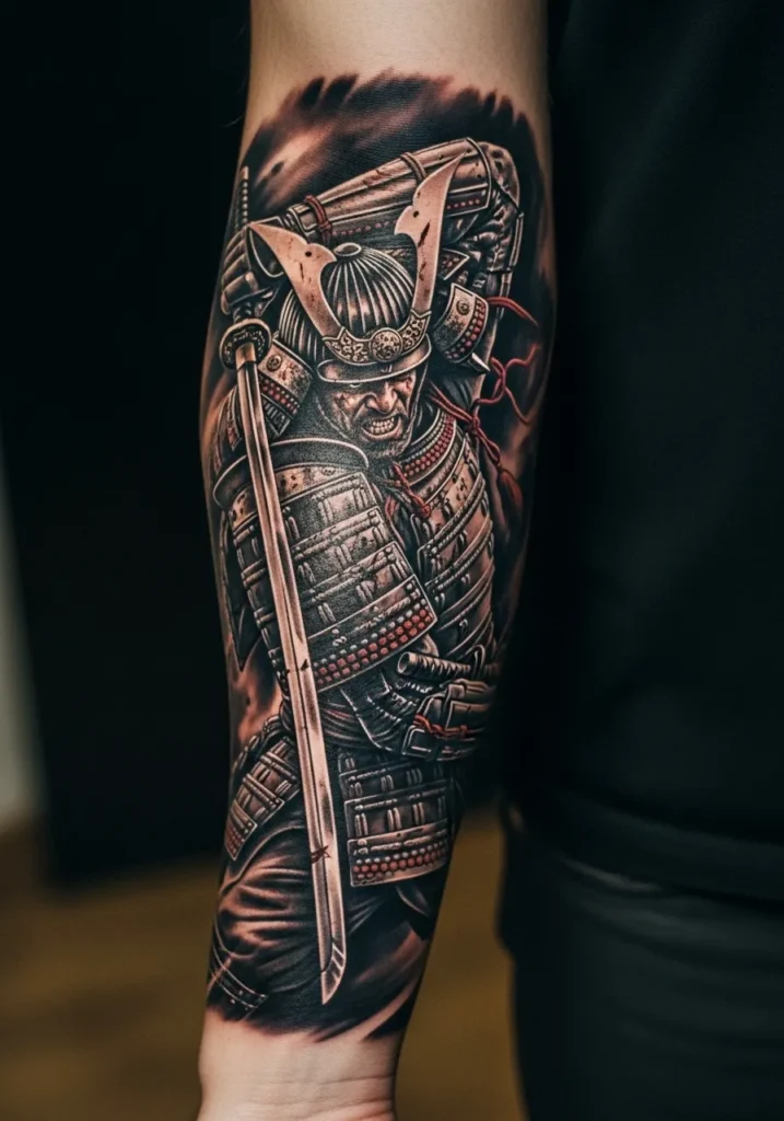 This design captures the fierce spirit of a samurai in battle, rendered with jaw-dropping realism. The sleeve runs from the forearm up, showcasing intricate armor details, a gleaming katana, and an intense expression full of determination. The muted red and gray tones give it depth and drama, almost as if the warrior could leap right off the skin.