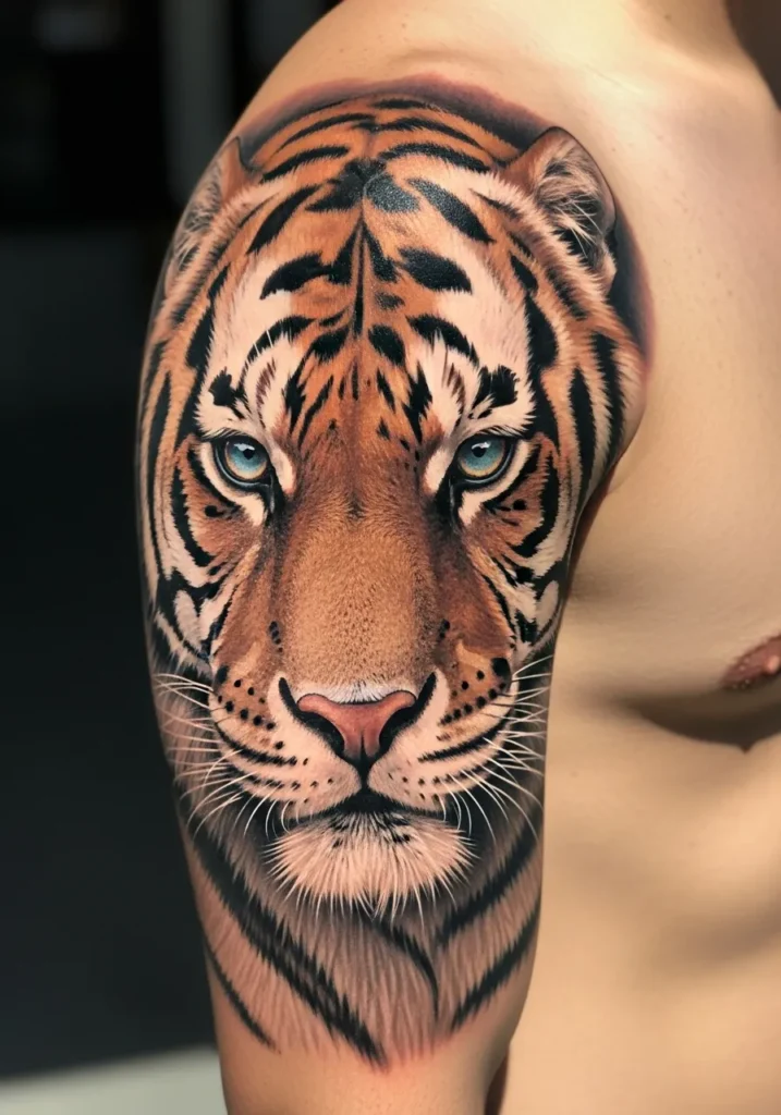 This tattoo showcases a hyper-realistic tiger face centered perfectly on the upper arm. The fur detailing, lifelike eyes, and rich orange and black striping make it look almost photographic. The shading is so clean that the tiger seems to be quietly watching, full of calm intensity and raw power.