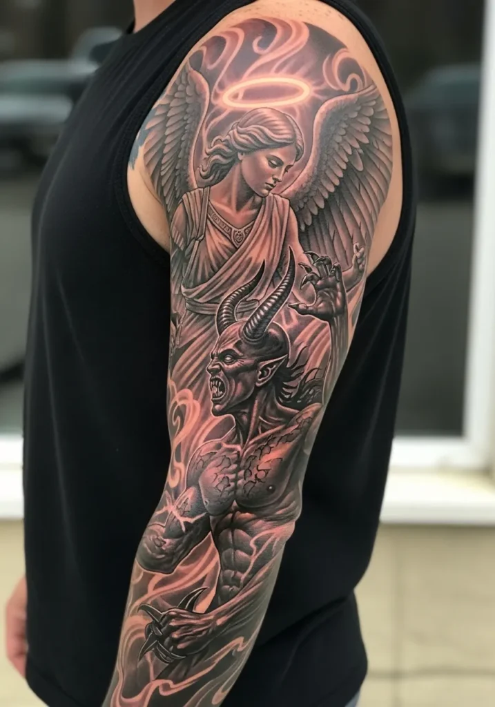 This dramatic sleeve shows the eternal struggle between light and darkness, featuring an angel with serene wings and a demon below, locked in tension. The shading moves from glowing halos to fiery smoke, creating a mesmerizing contrast. The black and gray realism, highlighted with subtle warm tones, makes every detail—from feathers to horns—feel alive.