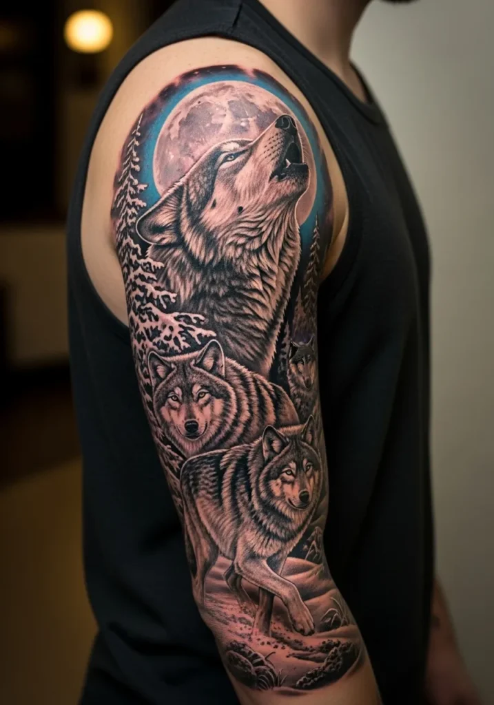 This stunning upper arm sleeve captures a pack of wolves beneath a glowing full moon. The main wolf howls at the night sky while others stand guard below, framed by snow-covered pines. Shades of cool gray and soft blue lighting give the whole piece an atmospheric, almost cinematic look.