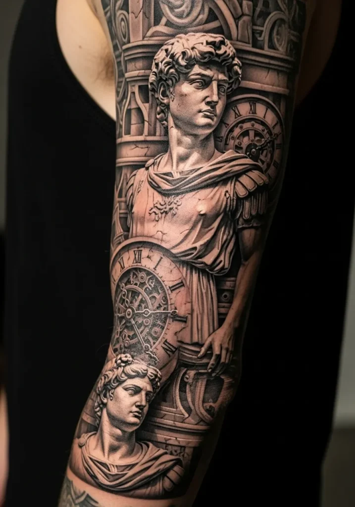 This masterpiece sleeve combines the grandeur of classical sculpture with the timeless beauty of clockwork. It wraps around the arm with intricate statues and gears interwoven in stunning grayscale realism. The Roman numerals and stone textures give it a sense of depth and movement, making it look almost three-dimensional.