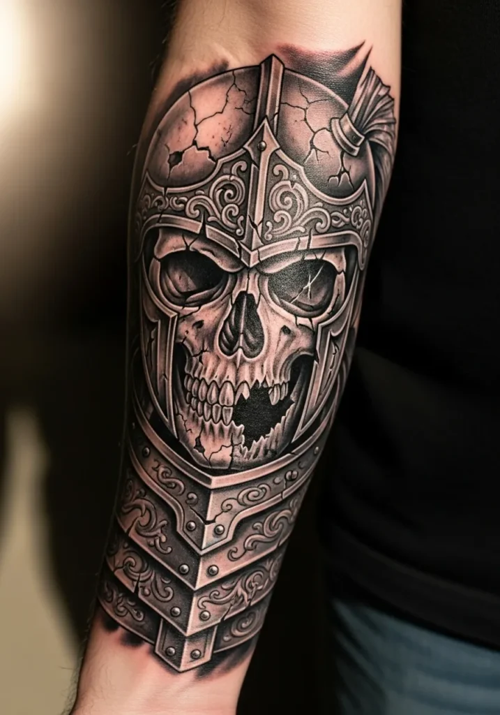 This bold forearm tattoo features a skull encased in an intricately detailed medieval helmet, complete with ornate engravings and battle cracks that give it raw realism. The shading transitions smoothly from deep blacks to soft grays, enhancing every metallic highlight and texture. Its placement perfectly follows the arm’s contour, making the design look powerful and seamless.