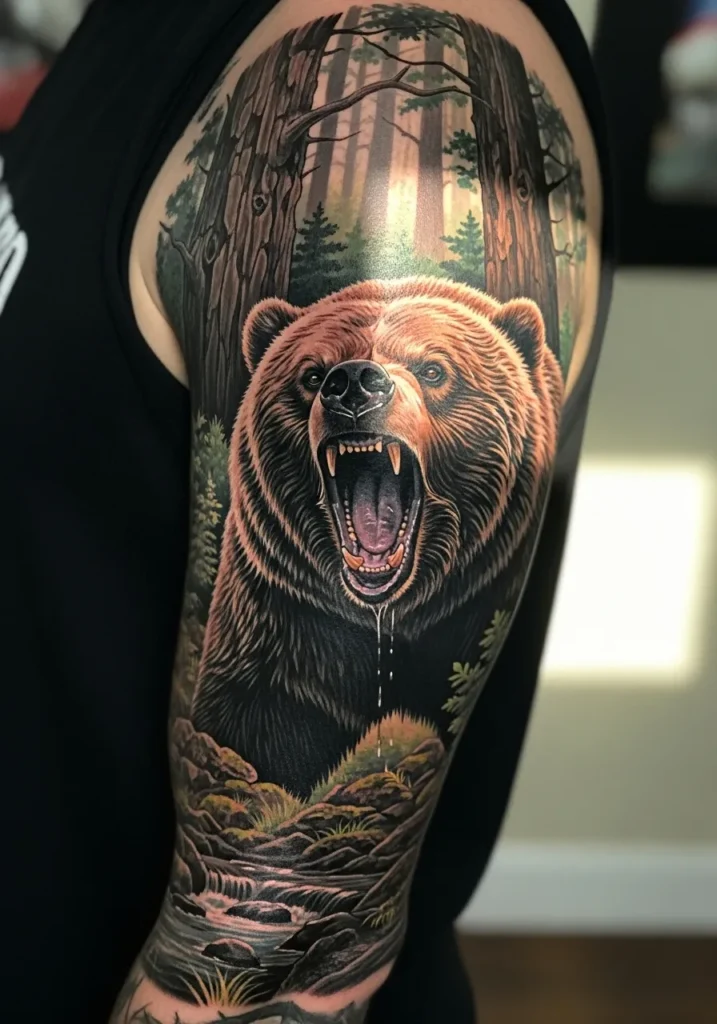 This impressive upper arm sleeve shows a roaring bear in stunning lifelike detail, set against a background of towering forest pines. The natural tones of brown, green, and soft amber bring warmth and realism to the scene, while the misty forest creates a wild, untamed vibe. The tattoo flows beautifully from shoulder to elbow, making it feel like a complete nature-inspired artwork.