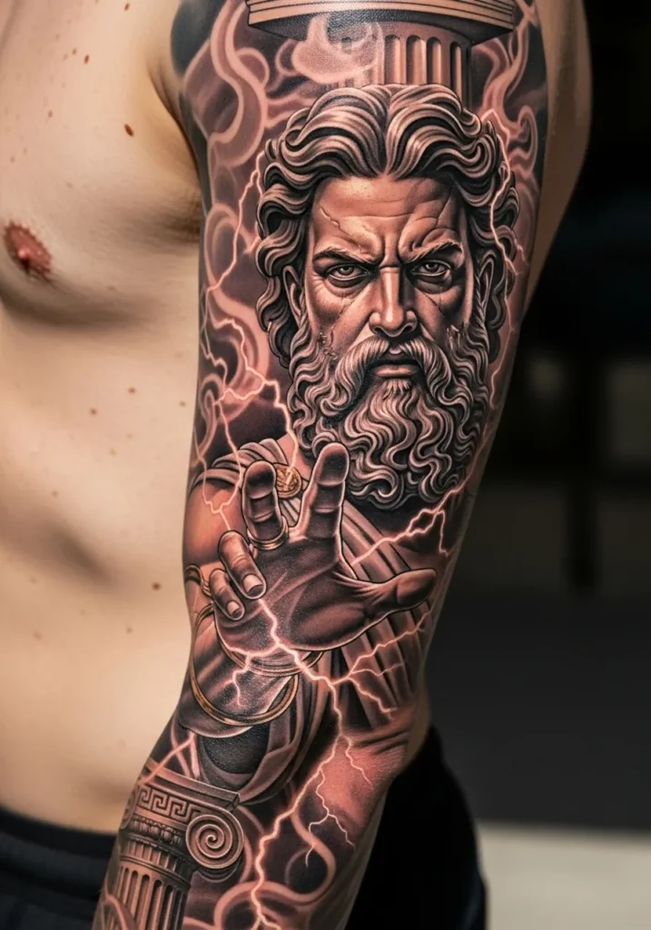 This dramatic realism sleeve centers on Zeus, the god of thunder, captured mid-action as lightning crackles around him. The shading work is immaculate, with glowing electric tones weaving through bold black and gray shadows. The columns in the background frame his divine power, giving the tattoo a truly mythic presence.