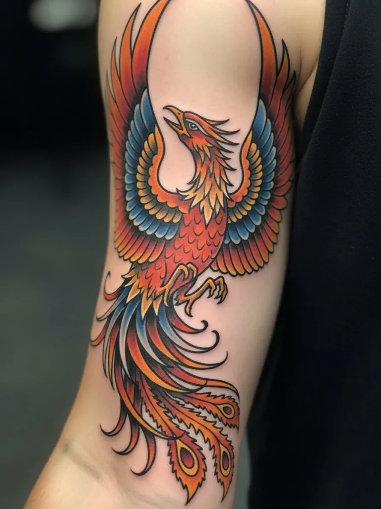 This neo traditional phoenix tattoo spreads across the upper arm with a bold and dramatic size that instantly commands attention. The wings rise high with warm oranges and deep reds while cool blue accents soften the intensity and add balance. The tail feathers spill downward in long curved shapes that almost feel like flames in motion. Thick black outlines frame every detail for that classic neo traditional punch. The placement follows the arm beautifully and gives the phoenix room to stretch and shine.