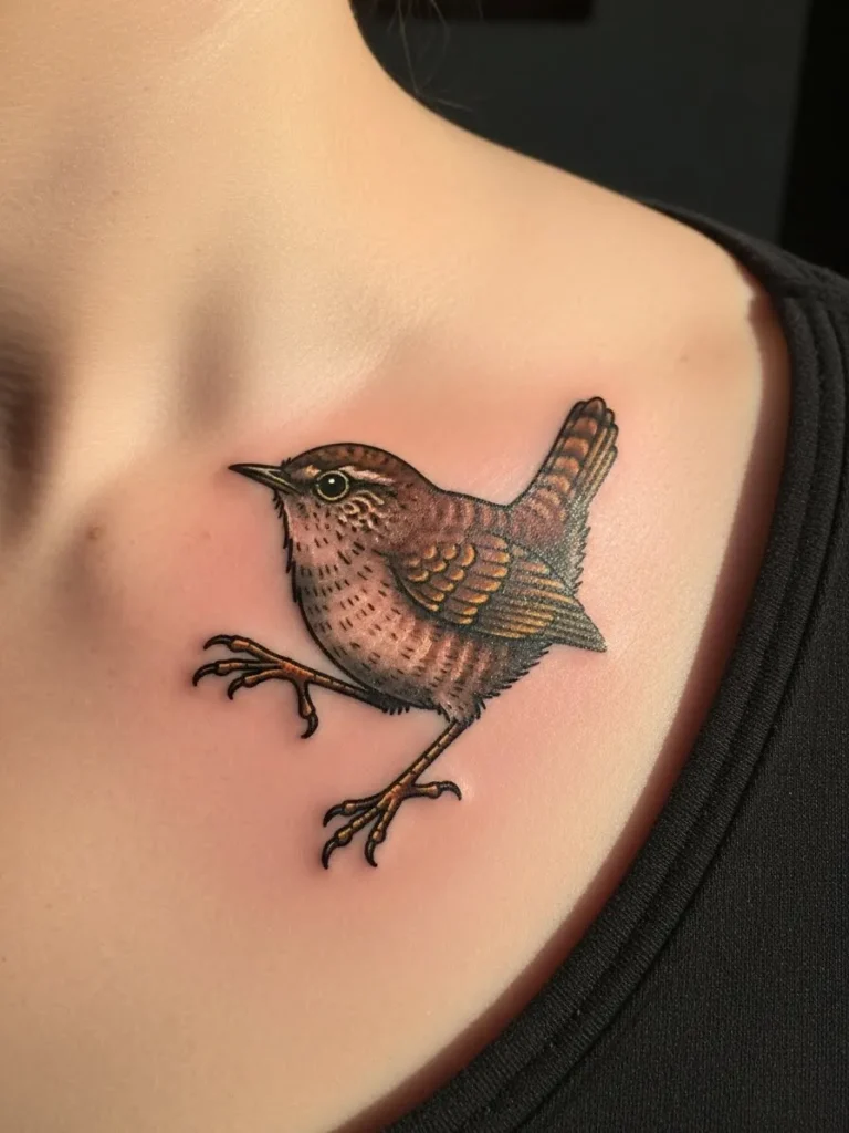This small wren tattoo sits just below the collarbone and uses warm browns and muted golds to create a soft natural look. The feather texture is delicate and the tiny feet and beak are drawn with such careful lines. The placement feels personal and pretty especially because the shape of the bird follows the curve of the chest. It is small but full of detail which makes it stand out.