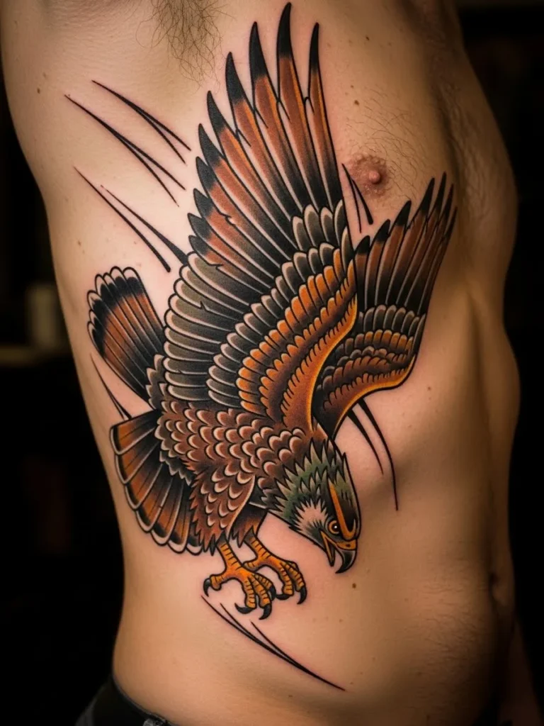 This bold hawk tattoo covers the side of the torso with wings stretched wide and sharp lines that capture intense movement. Rich oranges deep blacks and warm browns blend across the feathers creating a dramatic contrast. The sweeping motion lines behind the wings add even more speed to the pose. The placement along the ribs and stomach makes the bird look like it is cutting through the air.