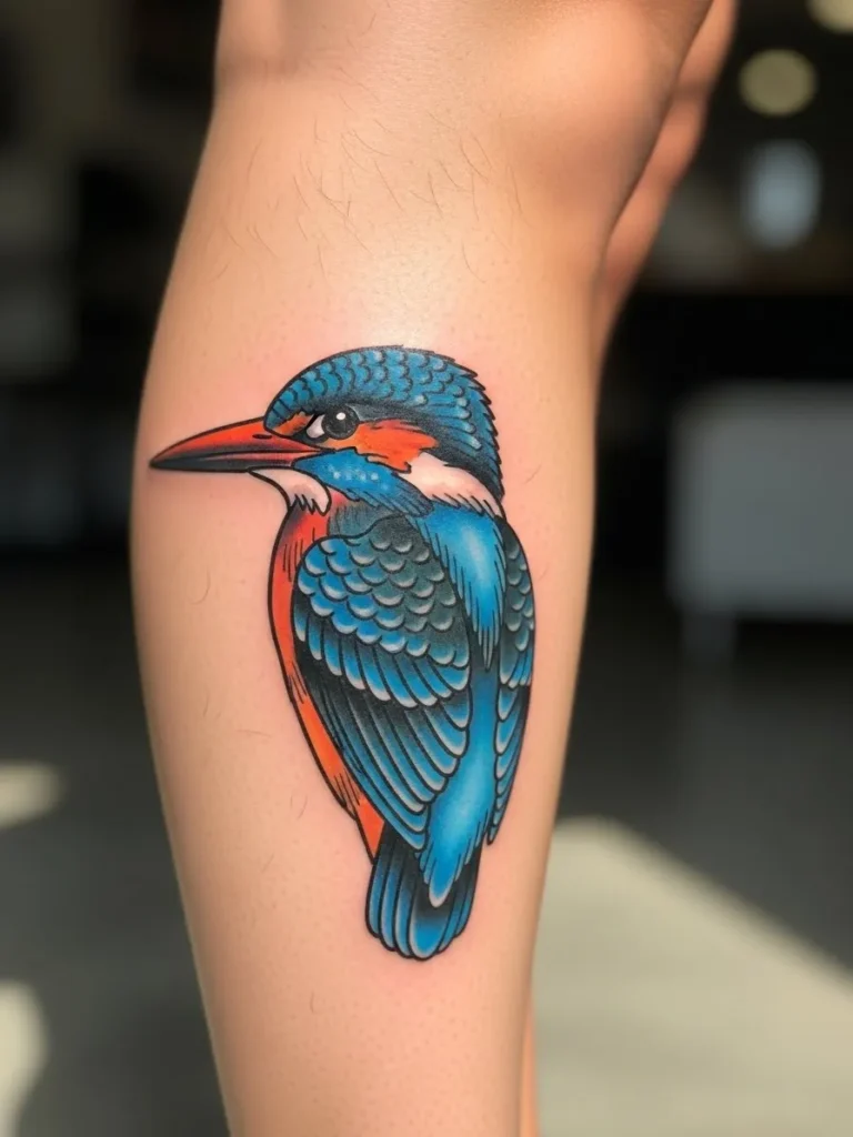 This vibrant kingfisher tattoo sits on the side of the calf and shows off a striking mix of electric blue and warm orange. The feathers are layered with smooth shading and bold outlines which give the bird a textured look that pops against the skin. The placement makes the kingfisher feel perched and alert and the size is perfect for showing off those gorgeous colors without overwhelming the leg.