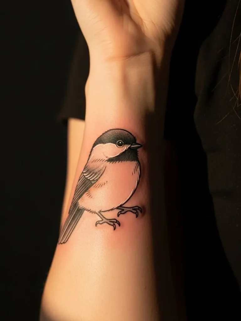 I adore how gentle this tattoo looks. It has a cozy charm that feels comforting in a quiet way. The softness of the shading makes the chickadee look almost cuddly and it gives off the sweetest peaceful energy. It is perfect for someone who loves subtle designs that still feel meaningful.