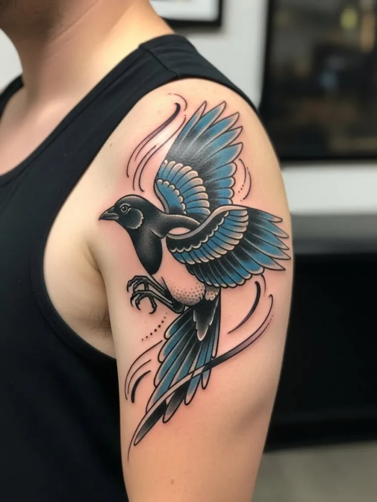 This dynamic magpie tattoo fills the upper arm with sweeping lines that curve around the bird as it takes flight. Deep blacks blend into teal toned blues across the wings giving the feathers a bold gradient. The pose captures a frozen moment of movement and the clean outlines make the design crisp and expressive. The placement gives the wings plenty of space which makes the tattoo look even more alive.