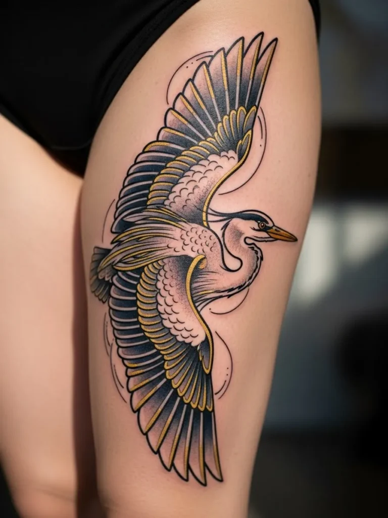 This beautiful heron tattoo stretches across the side of the thigh with long wings accented by soft gold highlights. The shading moves from dark to light in smooth gradients and the black outlines give the bird a strong elegant shape. The curves of the wings follow the natural shape of the thigh which adds even more flow to the design. The size is bold but still refined and the overall look is incredibly graceful.