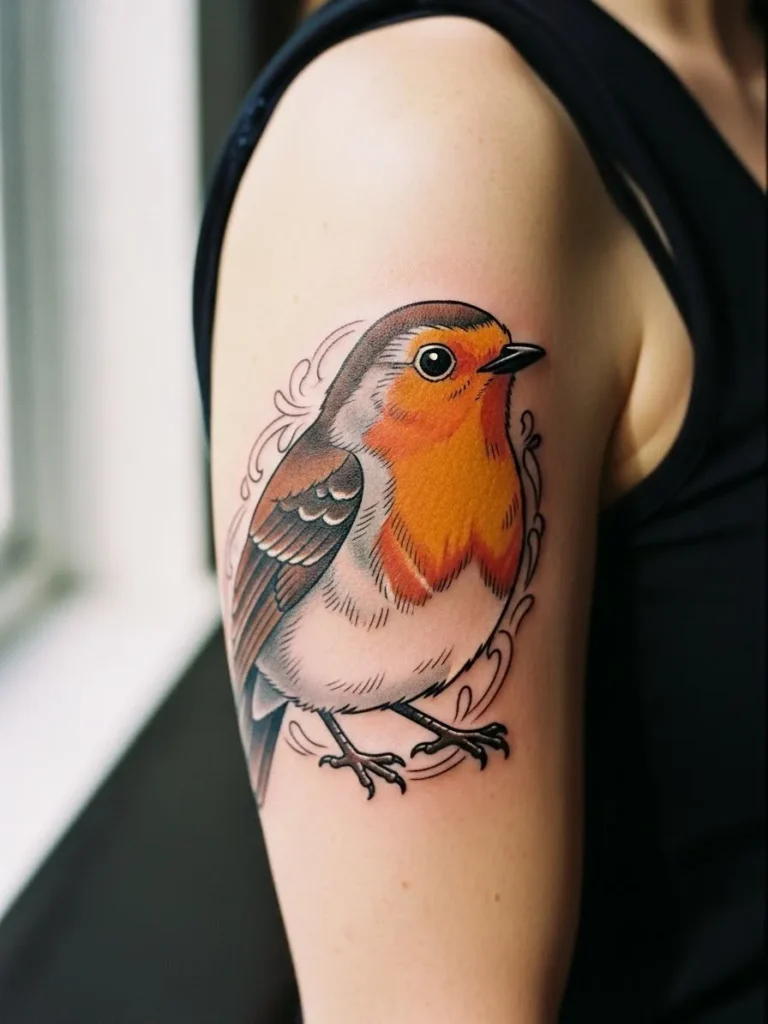 This charming robin tattoo sits on the upper arm and shows off the bird’s signature warm orange chest. The shading on the wings is soft and textured and the delicate curls behind the bird give the design a whimsical touch. The placement makes the robin easy to show off and the size is perfect for capturing lots of detail without feeling too big.