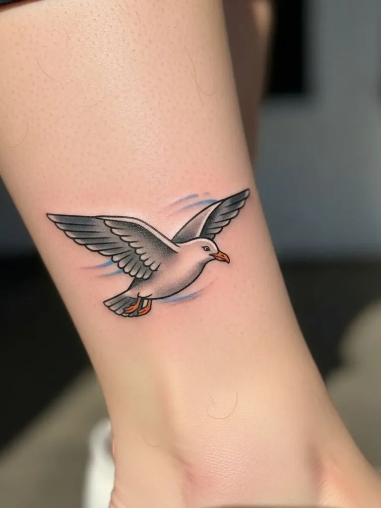 This cute seagull tattoo fits perfectly on the inner ankle with small wings spread and soft shading across the body. Light grey tones keep the look minimal while the clean outlines give it a crisp neo traditional feel. The tiny sweep of blue behind the wings adds a hint of motion that makes the gull look like it is gliding through the air.