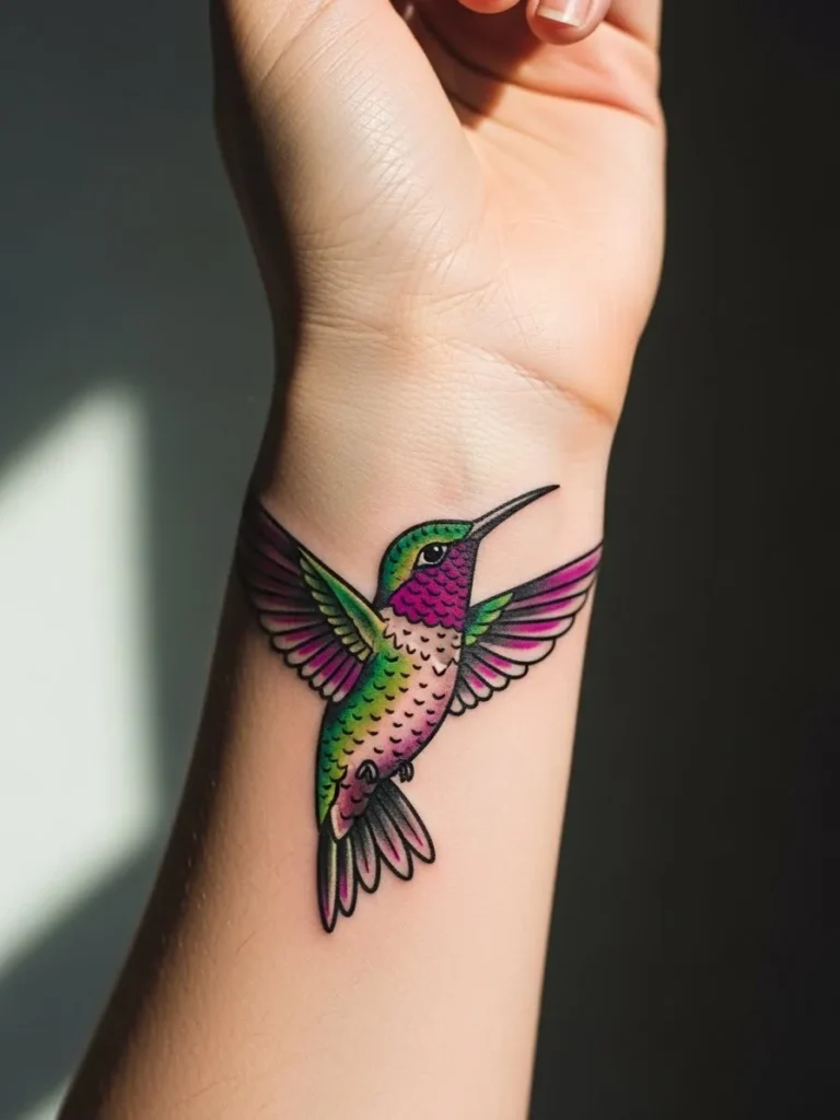 This small neo traditional hummingbird sits on the inner wrist with the cutest pop of color. Shades of pink green and purple blend across the wings and body while clean black outlines keep everything crisp and playful. The size is petite enough to feel delicate yet the details are clear and bright. Its wings stretch out mid flight giving a lovely sense of motion in such a tiny space.