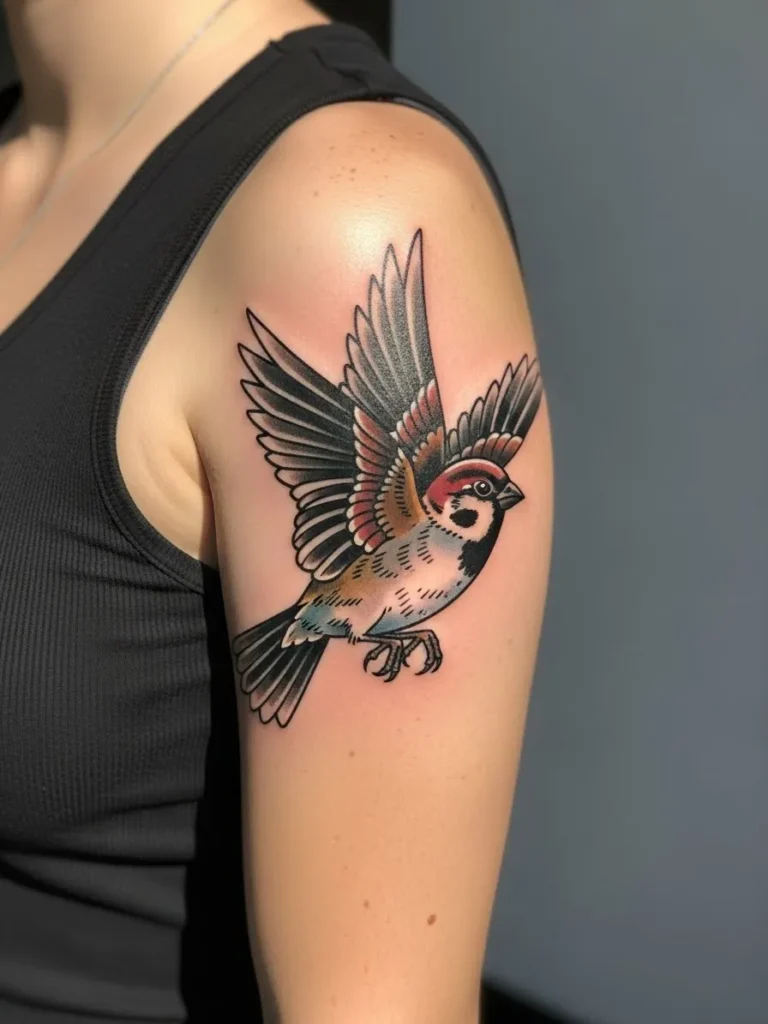 This lively sparrow tattoo sits on the upper arm with wings spread wide and warm brown tones accented by touches of red. The shading gives the feathers depth and the crisp outlines keep the design bold and classic. The upward angle of the wings adds a sense of motion and the placement follows the curve of the arm beautifully.