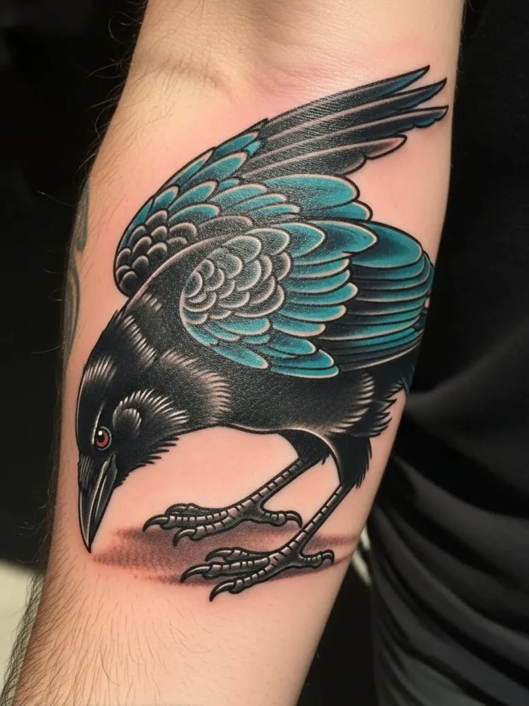 This medium sized neo traditional crow tattoo sits along the forearm and shows off deep blacks paired with striking teal highlights across the wings. The bird has a lowered stance that gives it a sense of intention as if it is ready to take a step. Thick outlines and smooth shading make each feather stand out while the teal adds a modern twist to the classic crow look.