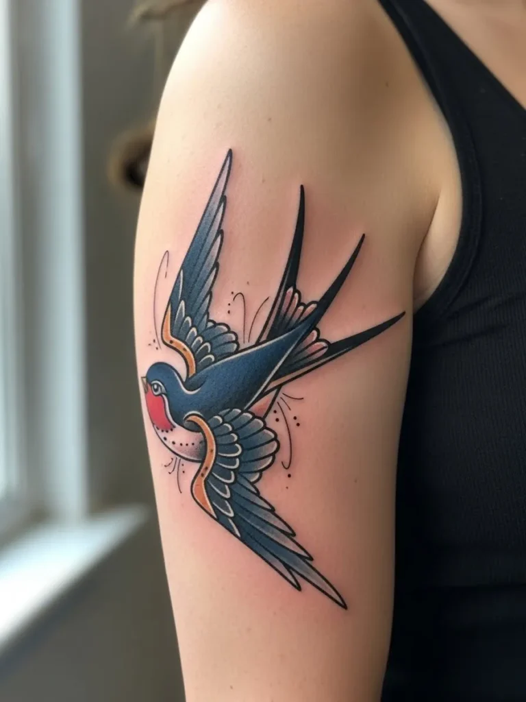 This upper arm swallow tattoo shows a beautiful neo traditional style with deep navy wings bright red accents on the face and soft beige highlights along the edges. The bird flies diagonally across the arm which creates a natural sense of movement. The outlines are clean and the shading is smooth giving the swallow a timeless and elegant look.