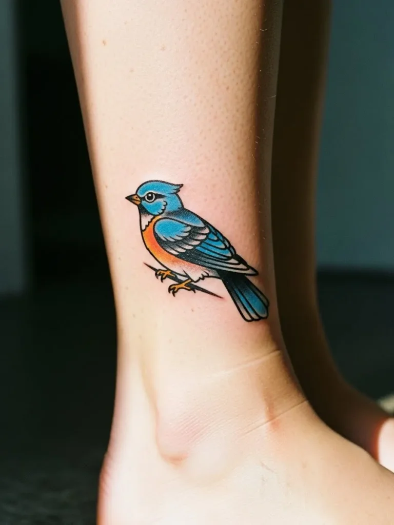 This small ankle tattoo features a vivid blue songbird perched with warm orange accents on the chest and soft white details around the face. The design uses bold outlines and bright neo traditional color blocking which keeps the bird looking crisp even at a smaller size. The placement on the ankle makes it feel delicate and charming and the shape sits naturally along the curve of the leg.