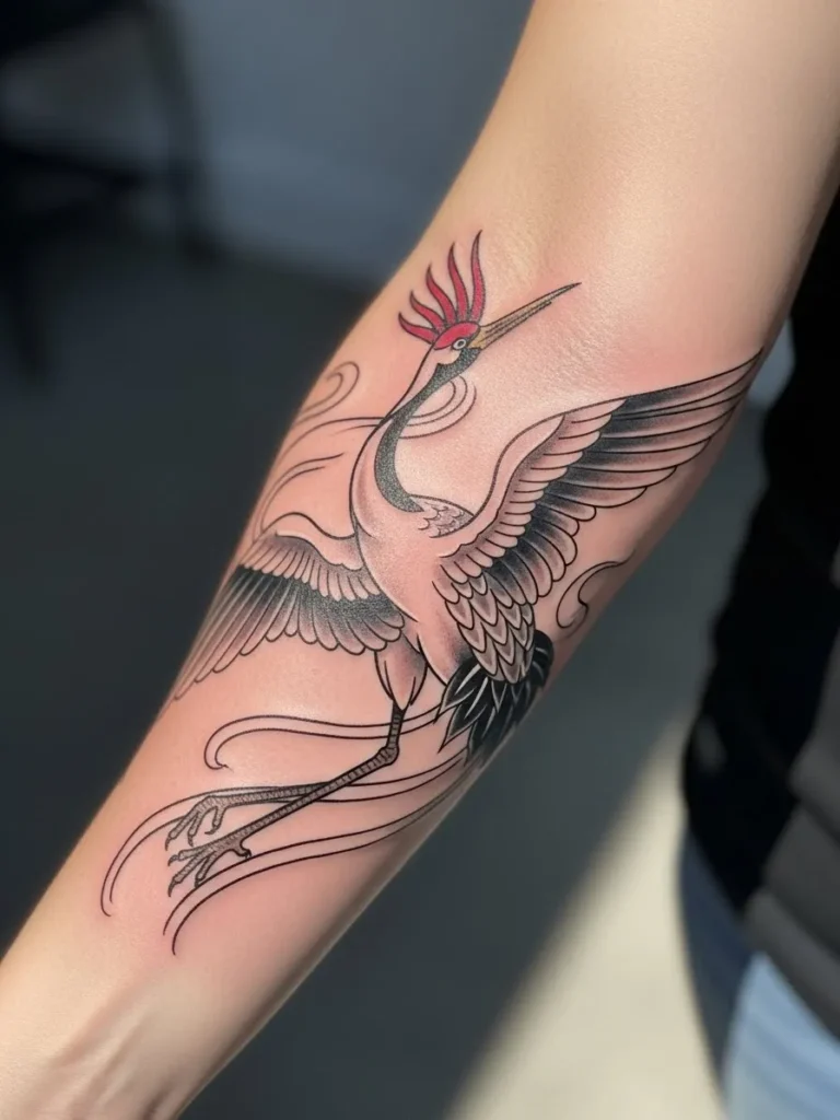 This graceful crane tattoo stretches across the forearm with long sweeping lines that follow the natural shape of the arm. The wings are opened wide with soft black shading and delicate highlights. A bold red crest gives the design a bright focal point while the long legs and tail feathers curve in fluid shapes that feel almost like watercolor swirls even though it is fully neo traditional. The size is medium and the placement makes the crane look like it is mid flight.