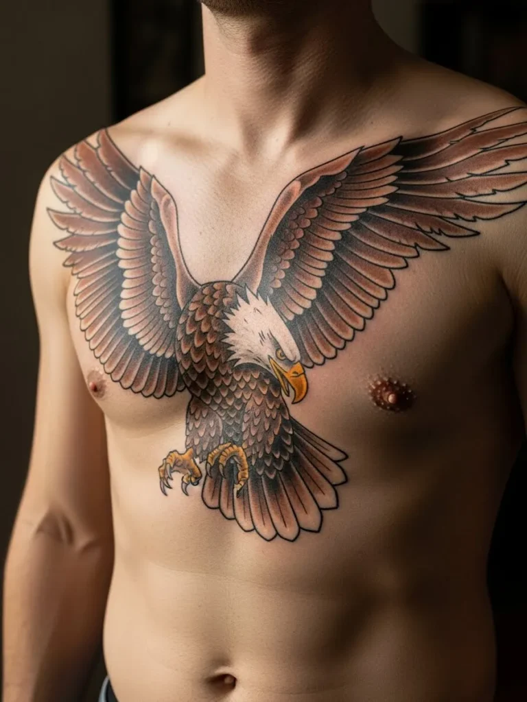 This large chest tattoo features a powerful eagle with wide outstretched wings that extend across both sides of the chest. Warm browns and soft creams fill the feathers while bold black outlines keep everything sharp. The eagle is captured mid swoop with its talons ready which adds so much motion to the design. The size and placement create an incredible visual impact that feels strong and commanding.