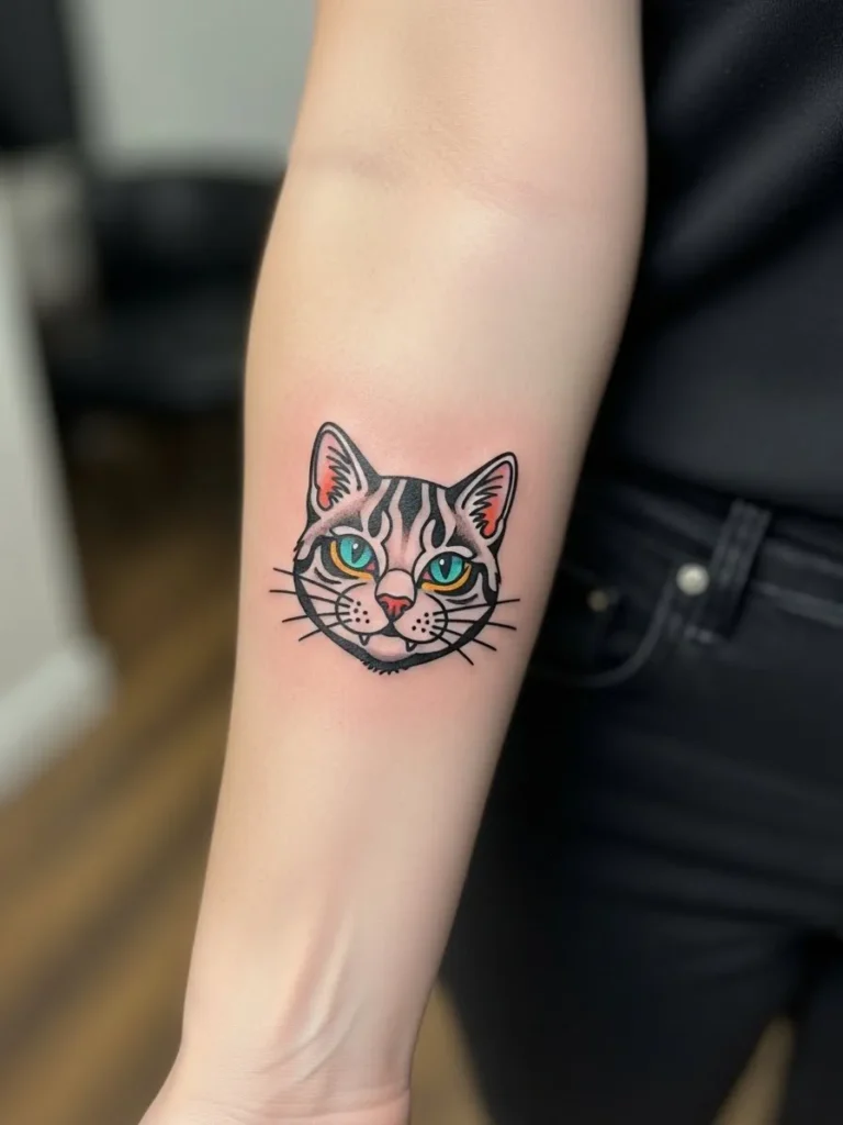 This sweet neo traditional cat face tattoo sits on the inner forearm and has a clean medium size that shows off every line. Bold black outlines shape the whiskers and stripes while soft pink tones warm the ears and nose. The eyes glow with shades of teal and gold that stand out beautifully against the crisp skin. A hint of natural redness around the tattoo makes it look freshly done and full of life.