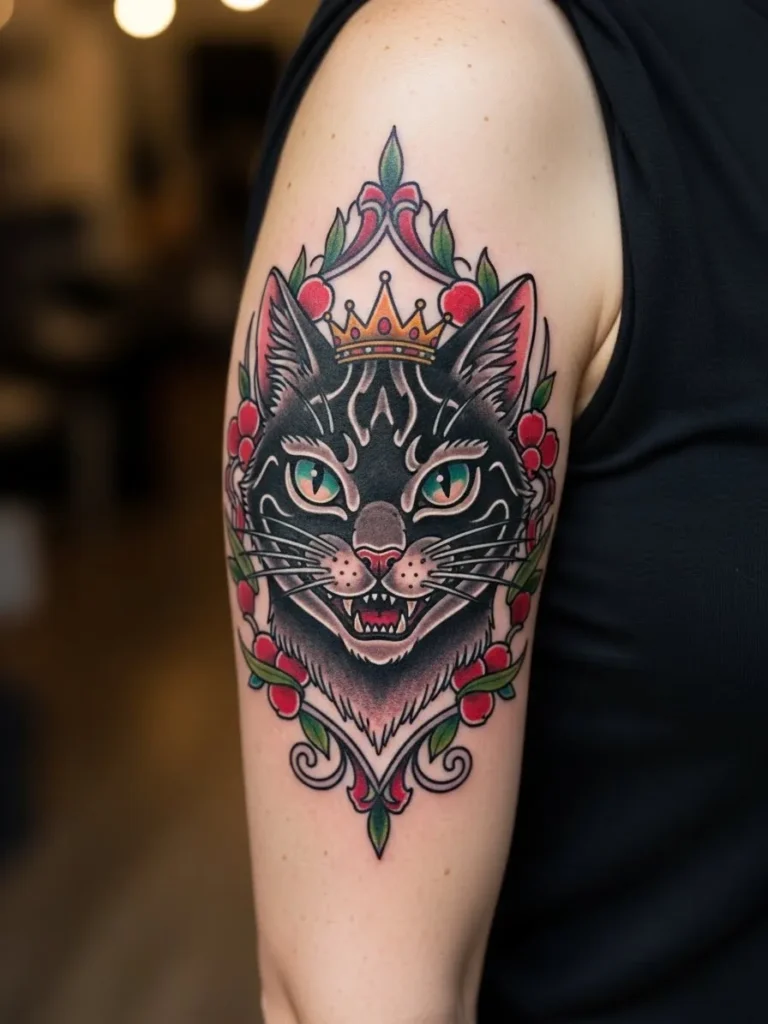 This neo traditional upper arm tattoo shows a fierce black cat framed with decorative leaves and bright red berries. A golden crown rests above its head adding a royal touch. The piece is medium to large with strong contrast between the dark fur and the vivid green and red accents. The cat’s teal eyes stand out beautifully and the symmetrical framing gives it a polished look.