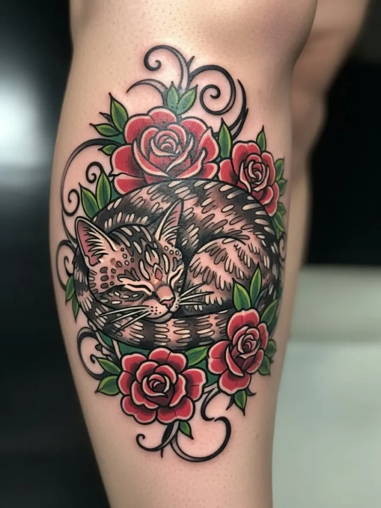 This dreamy neo traditional tattoo sits on the side of the leg and shows a curled up cat resting among bold red roses. The size is medium to large which gives plenty of space for the swirling black linework and deep green leaves. The shading on the fur feels soft and textured while the rich red petals add a warm pop of color. The clean outlines make the whole piece feel polished and full of charm.