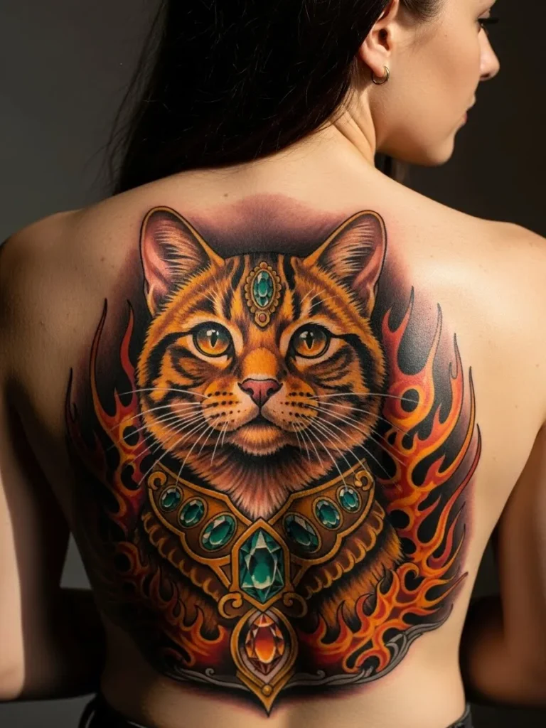 I think this design is pure visual power. It feels royal and mystical like the cat is guarding a secret treasure. The gems bring such a luxurious touch and the fire adds the perfect level of intensity. It is the kind of tattoo that turns a whole back into a statement piece.