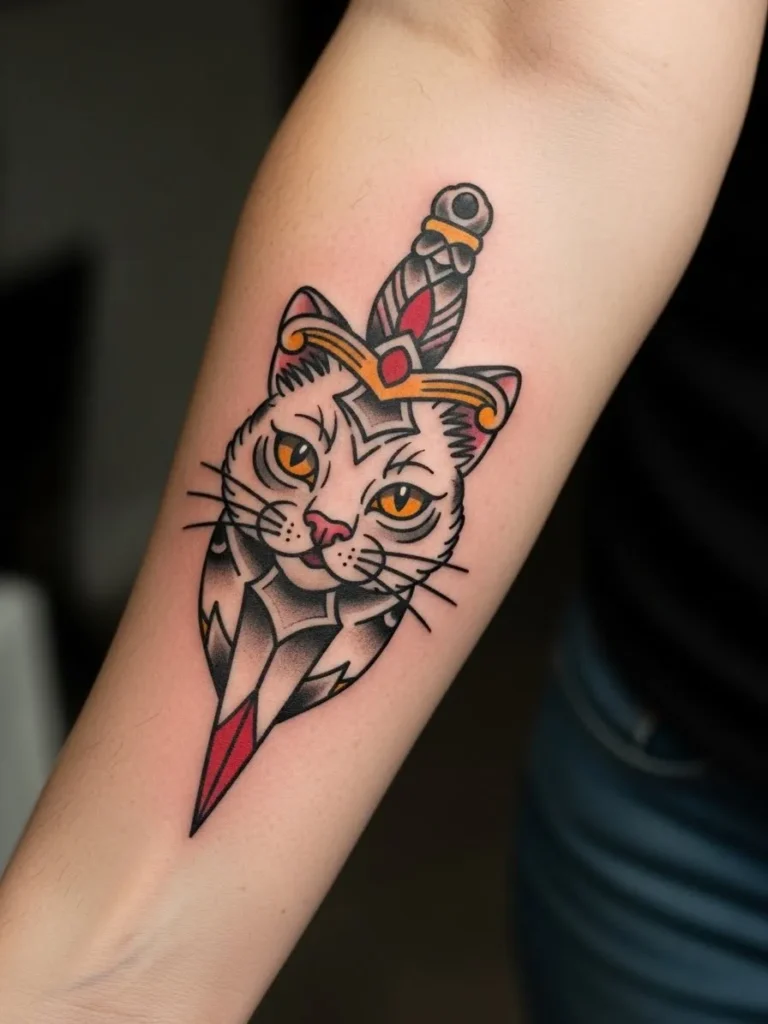 This neo traditional forearm tattoo shows a cat’s face fused with the shape of a dagger. The size is medium with bold black outlines and warm red and gold accents that highlight the sharpened geometric shapes. The cat’s yellow eyes stand out beautifully against the clean shading and the blade shape tapers smoothly down the arm.