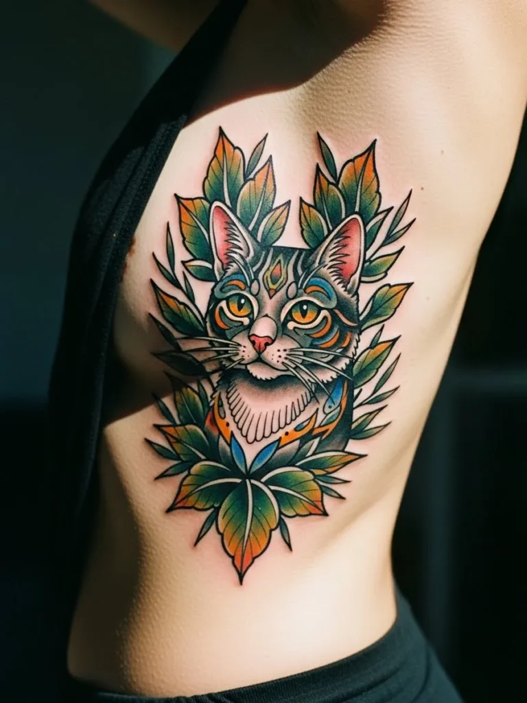 This rib tattoo features a striking cat surrounded by a lush arrangement of leaves in green orange and teal. The piece is medium to large and flows naturally along the ribcage. The cat’s expressive golden eyes pop against the cool tones of the fur and the decorative pattern on the forehead adds a mystical touch. The sunlight highlights the crisp linework and the subtle shading.