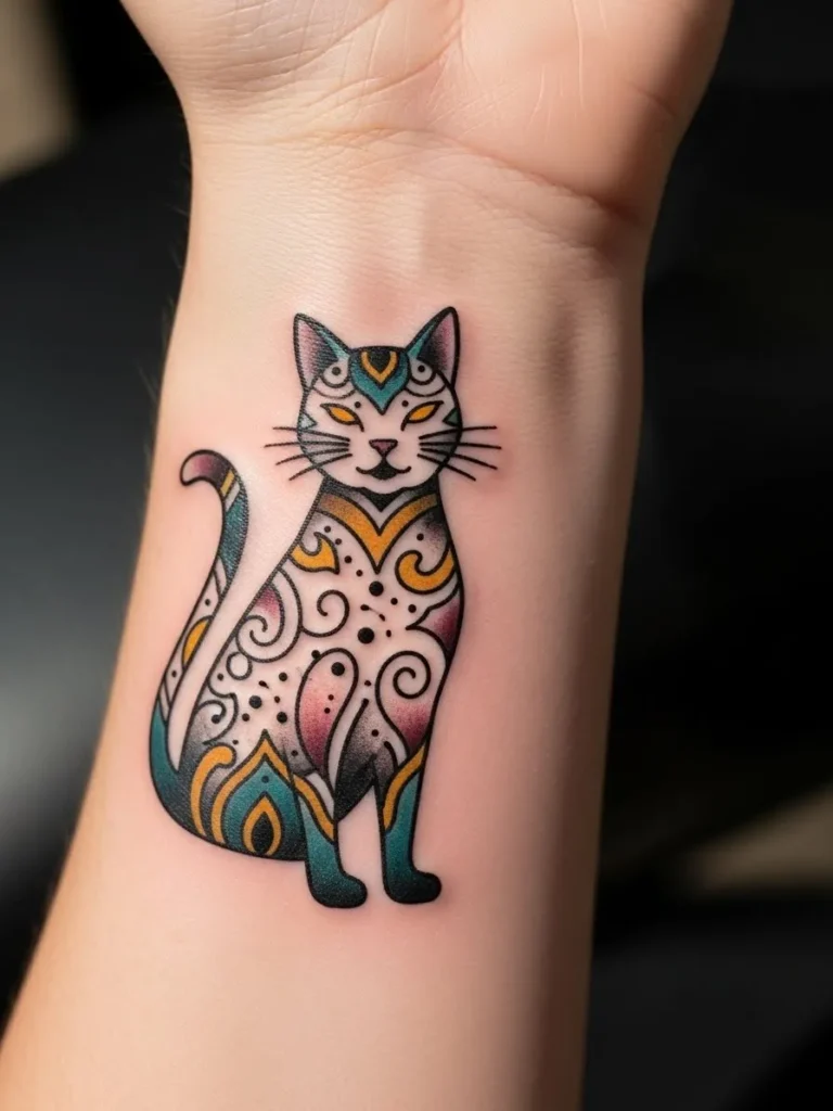 This small wrist tattoo features a stylized sitting cat with elegant swirling patterns across its fur. The design blends teal gold and soft pink shades with clean black outlines that make each detail stand out. The compact placement keeps it dainty while the ornamental shapes give it a playful yet artistic look.