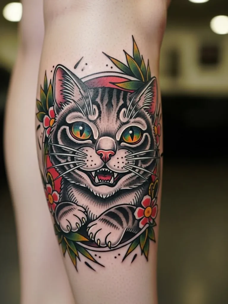 This lively neo traditional tattoo sits on the side of the leg and captures a mischievous little cat peeking out with its paws stretched forward. The medium size gives plenty of room for crisp black outlines and bold shading. Warm red accents highlight the background and the tiny flowers while the cat’s bright golden eyes make the whole piece pop. The leafy shapes around the edges give it a cute framing effect that feels fun and full of personality.