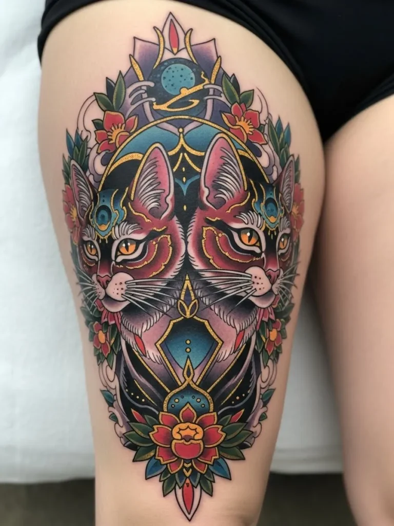 This stunning thigh tattoo features two mirrored cats arranged inside an elaborate ornamental frame. The size is large and the design uses rich jewel tones like deep teal gold red and purple. Intricate patterns wrap around the cats with floral accents and glowing celestial shapes above their heads. The symmetry makes the piece look polished and the bold neo traditional outlines keep everything clean and striking.