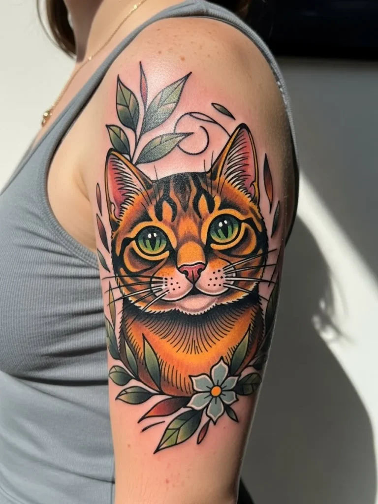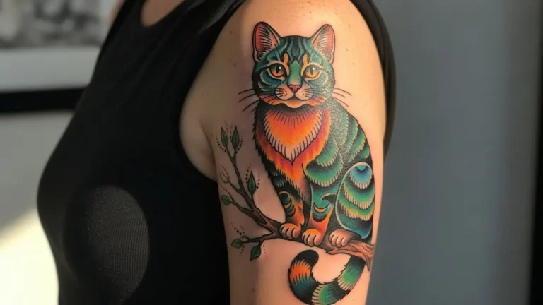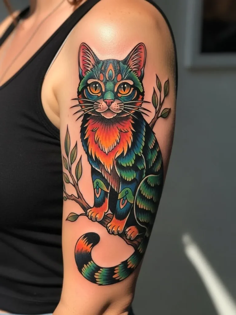 This stunning upper arm tattoo features a neo traditional cat perched serenely on a leafy branch, showcasing a riot of vibrant, playful colors. The cat’s body is intricately patterned with teardrop and feather shapes in gorgeous shades of teal, deep green, and black, making its fur look almost jewel-toned. Its chest and ruff are a dazzling mix of fiery orange and warm yellow, contrasting beautifully with the cool tones of its body, and its expressive, amber eyes draw you right in. The overall size is perfect for an upper arm placement, fitting the curve nicely and allowing for all those fabulous little details.