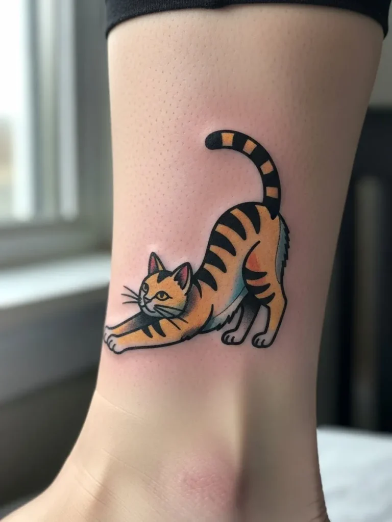 This absolutely adorable little tattoo is perfectly placed on the ankle, just above the foot, making it a cute and subtle piece. Done in a classic neo traditional style, the size is smaller and understated, perfect for a first tattoo or for someone who loves minimal ink. It features a cheerful tabby cat mid-stretch, showing off that classic “downward dog” yoga pose with its tail curved up. The colors are simple but punchy, with a lovely warm orange and black stripes, accented by a hint of soft blue shading that gives it a nice traditional pop.
