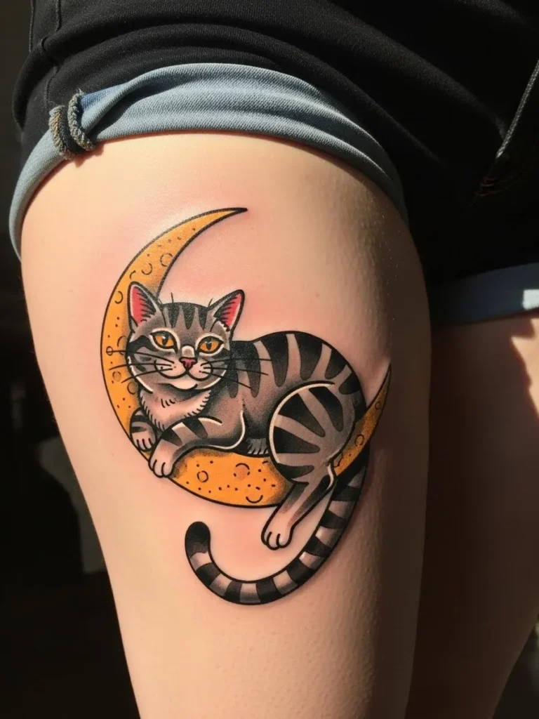 This neo traditional thigh tattoo features a relaxed striped cat curled over a bright golden crescent moon. The piece has a larger size that fills the space with smooth shading and bold outlines. Warm oranges and soft greys balance each other and give the cat a cozy glow in the sunlight. The natural skin texture shows through the shadows which adds to the charm.