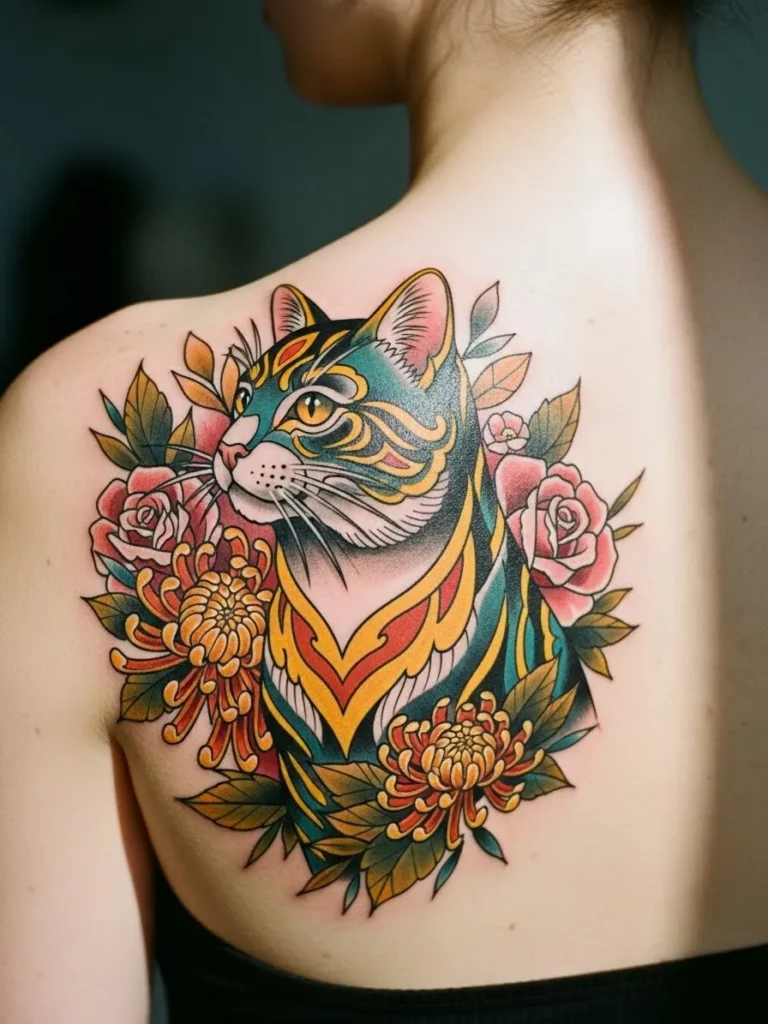 This stunning neo traditional back tattoo showcases a cat surrounded by blooming chrysanthemums and roses. The size is large and covers the upper shoulder with bold color work. The cat features teal, orange, gold, and deep black lines that create a striking patterned look. Soft pink petals and leafy details frame the cat and make the whole piece feel full and lively.