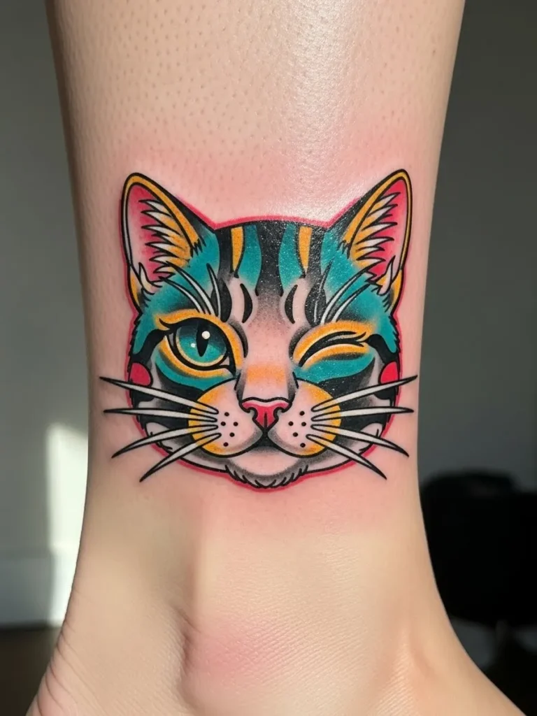 This adorable neo traditional cat tattoo sits right above the ankle and shows a cheeky winking face. The size is small but the detail is impressive with bright teal, orange, and yellow accents woven into the fur markings. The black outlines are crisp and the subtle redness makes the tattoo feel freshly finished and full of warmth.