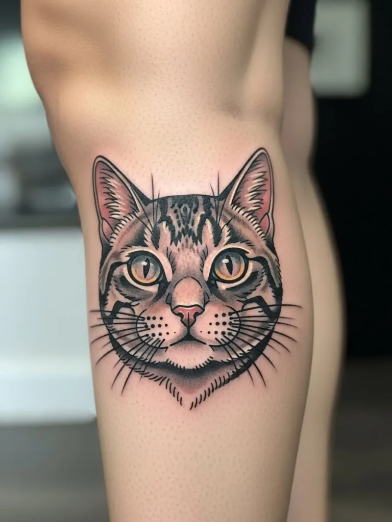 This calf tattoo shows a classic neo traditional cat portrait with soft shading and sharp lines. The medium size fits the leg perfectly and highlights the gold toned eyes along with the dark whisker lines. Gentle gradients of grey give the face depth while the surrounding skin texture keeps everything real and natural.