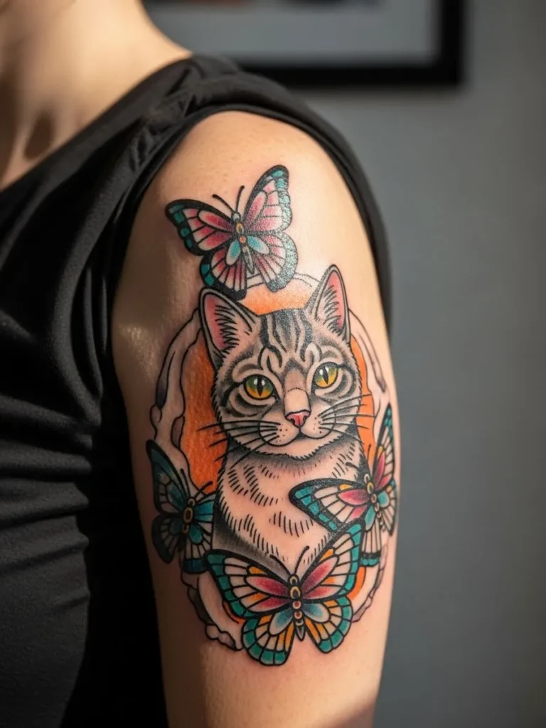 This vibrant neo traditional tattoo sits on the upper arm and features a calm grey tabby framed by a cluster of butterflies. The size is medium to large which gives space for the teal, coral, and soft pink tones to shine. Bold outlines and smooth shading shape the wings while the warm golden background adds a soft glow around the cat. The natural texture of the skin peeks through the color work which makes the whole piece feel fresh and lively in the sunlight.