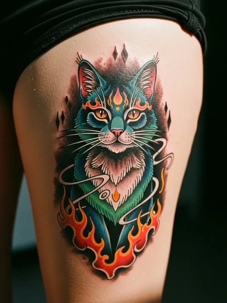 This bold neo traditional thigh tattoo showcases a magical cat design with teal fur shining against warm orange flames. The size is large and the crisp outlines make every detail pop. The eyes glow with gold and the swirling smoke shapes add a sense of motion. The flames wrap upward with smooth gradients and the small decorative symbols on the forehead add a mysterious touch.