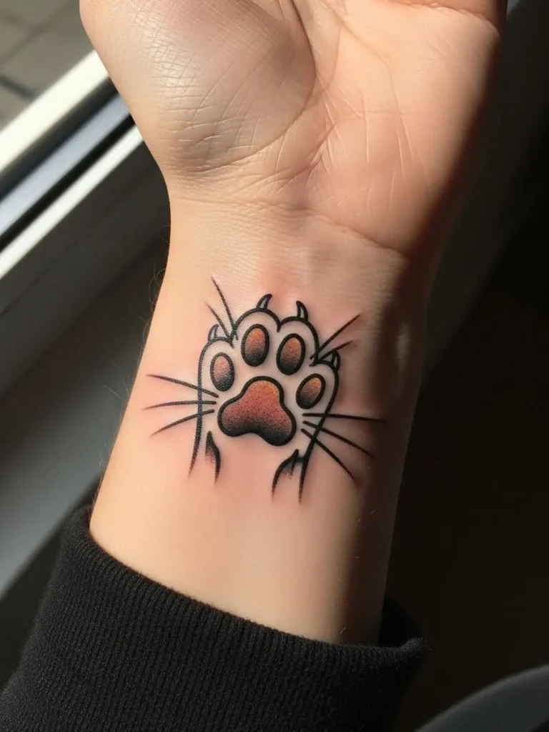 This adorable neo traditional wrist tattoo features a tiny cat paw reaching upward with soft shading and warm peach tones. The design is small and cute with clean black outlines around each little toe bean. The placement on the wrist keeps it visible and sweet and the soft sunlight brings out the natural texture of the skin.