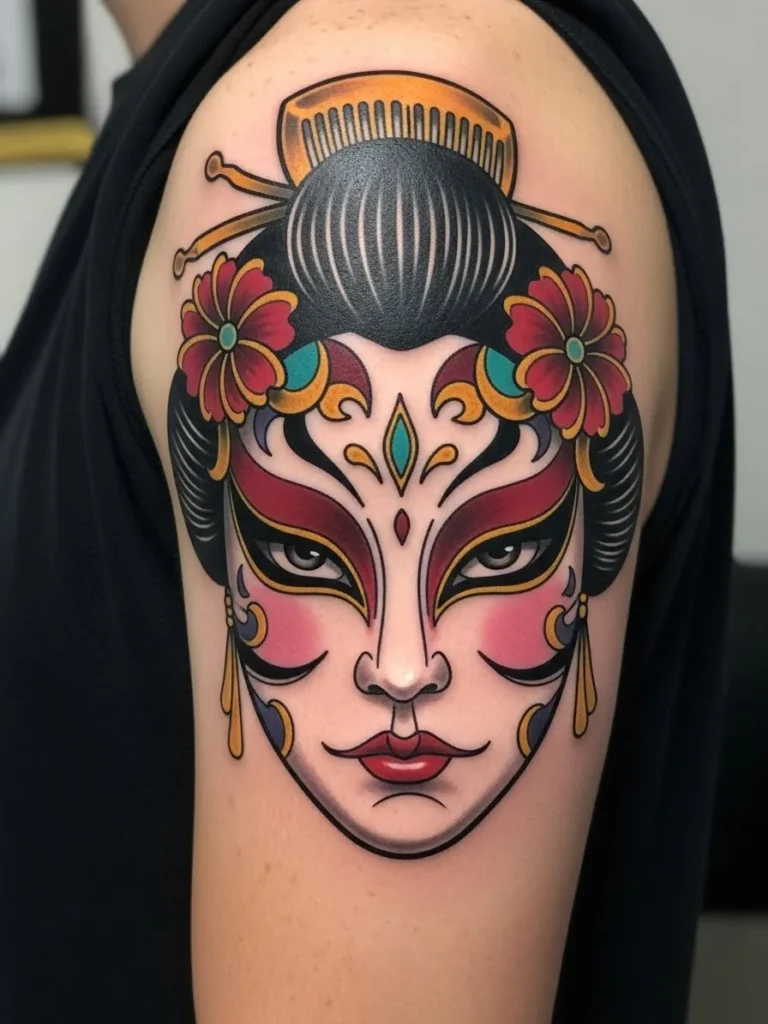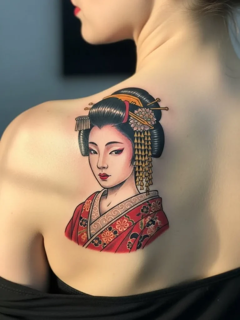 I love how this tattoo merges the elegance of a traditional geisha with the vivid, striking colors of neo-traditional art. The placement on the shoulder adds depth and makes it a statement piece that still retains an air of sophistication. The use of bold reds and golds is eye-catching without being overwhelming, and the overall effect is simply captivating. This tattoo is a stunning representation of traditional beauty with a modern twist.