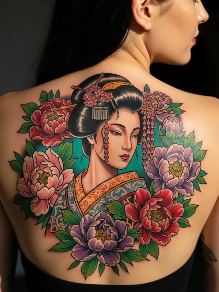 This stunning back tattoo features a geisha surrounded by beautiful peonies, creating a harmonious blend of traditional Japanese symbolism and modern neo-traditional style. The geisha’s elegant posture and classic features are contrasted with the soft, blooming flowers that surround her, adding depth and richness to the design. The colors are vibrant and carefully chosen, with a balance of reds, pinks, greens, and golds. The back placement allows the design to flow naturally across the skin, making it a bold and eye-catching piece.