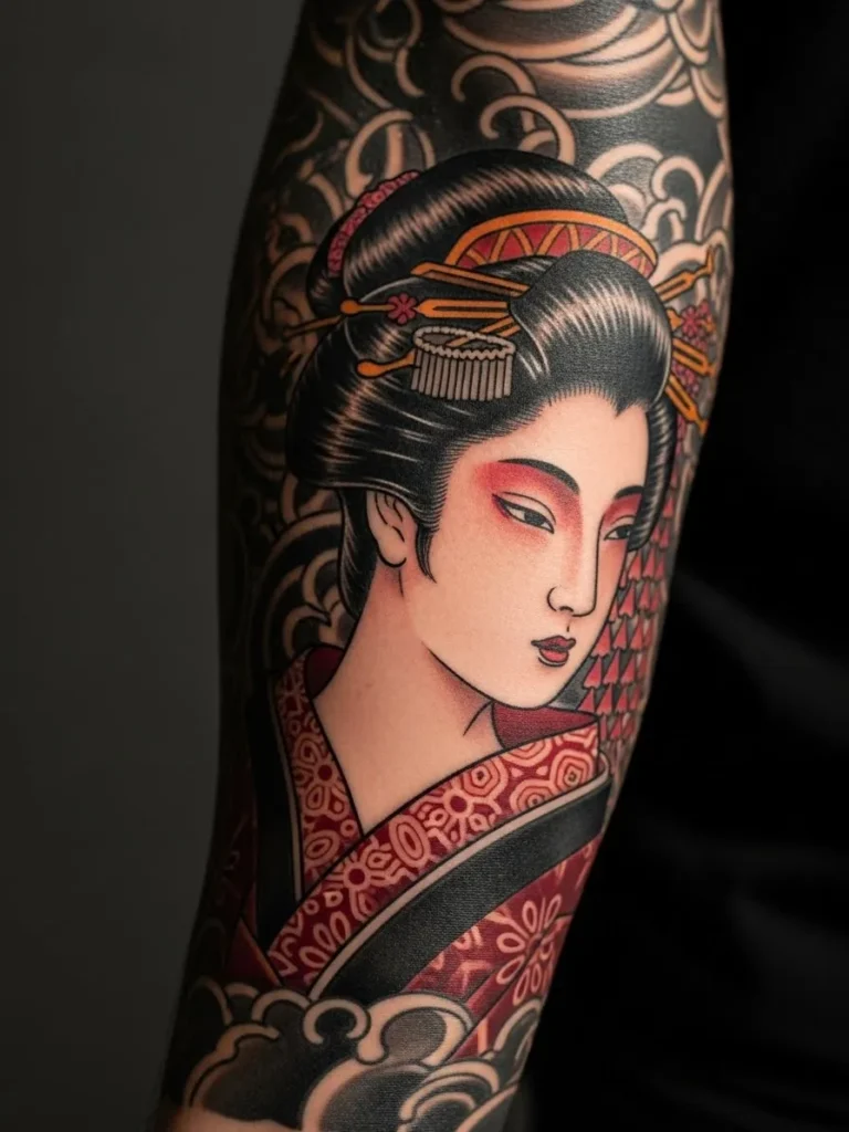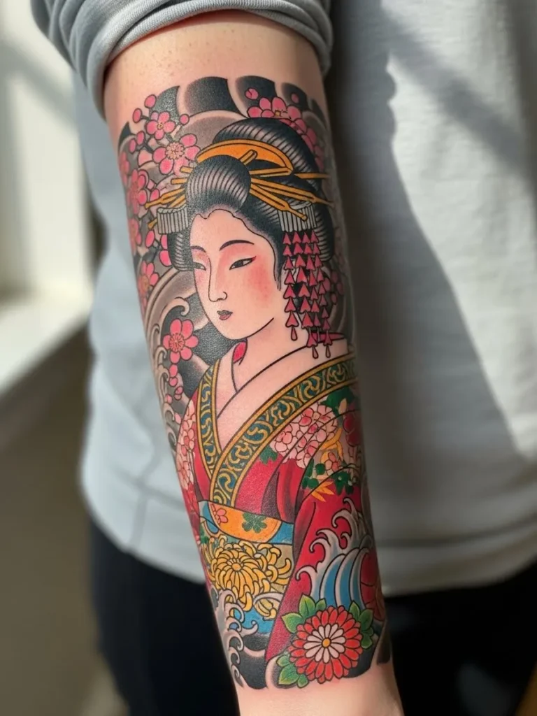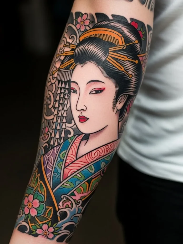 What I love about this design is how the floral elements accentuate the geisha’s beauty. The combination of the bright colors and the clean lines adds an elegant yet modern twist to the traditional geisha style. The placement on the forearm makes this tattoo a stunning piece that is both wearable and eye-catching. It’s a fantastic example of how tradition can be reimagined with contemporary artistry.
