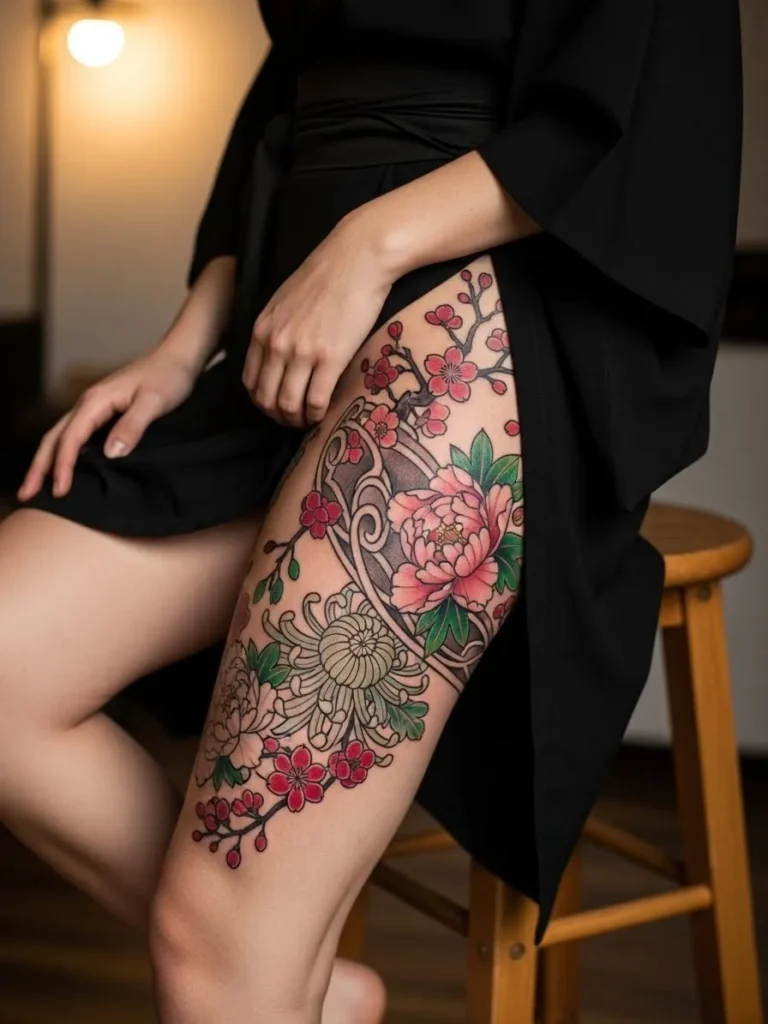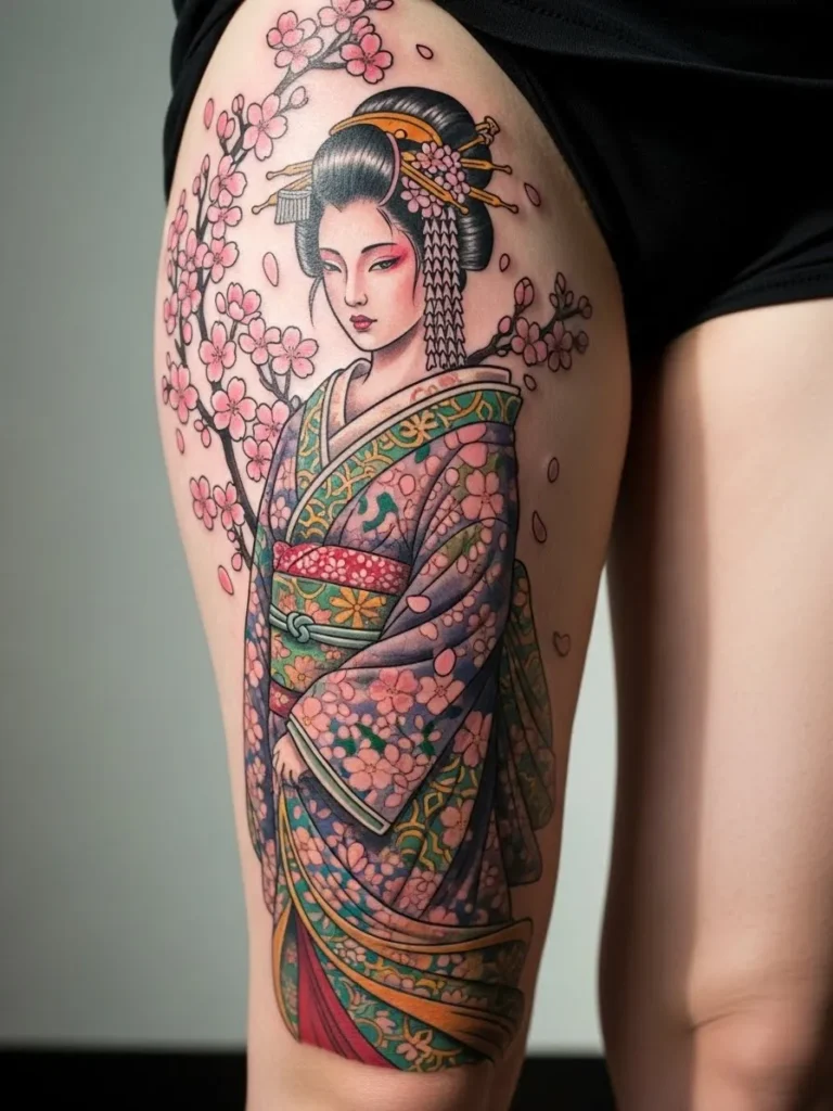 This large tattoo on the thigh features a geisha in a beautifully detailed kimono, surrounded by peonies and other floral elements. The design is rich in color, with bold reds, blues, and greens making the geisha and her kimono pop. The soft shading and intricate lines give the tattoo depth, and the flowers surrounding her add a layer of softness and balance to the overall piece. The thigh placement allows for a large, flowing design that curves naturally with the body.