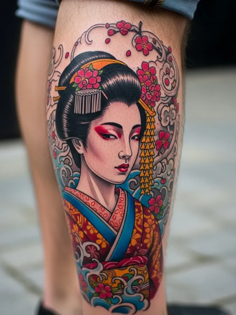 This tattoo, located on the calf, features a striking geisha adorned in a vibrant kimono, surrounded by intricate floral patterns. The geisha’s serene expression and detailed hairstyle are highlighted by the soft pink and red tones of the flowers. The colors, from the bright oranges and blues of the kimono to the deep blacks and yellows of the floral details, create a balanced contrast, while the gentle shading adds depth. The flowing design complements the leg’s natural curves, making this tattoo both visually pleasing and dynamic.