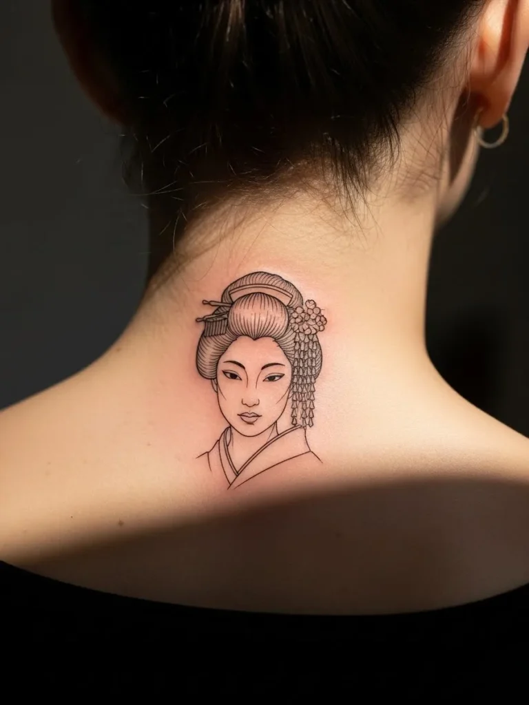 I absolutely love the simplicity of this design. The understated beauty of the geisha’s face and hairstyle feels so refined, yet it carries such meaning. The back-neck placement gives it a soft, personal touch, and the clean lines keep it modern and timeless. This tattoo proves that you don’t need bold, elaborate designs to make a statement—it’s all about the elegance in simplicity.