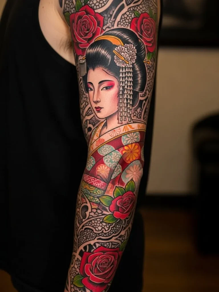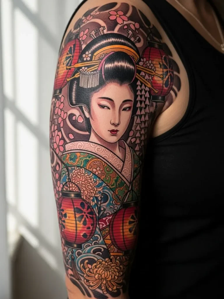 This sleeve tattoo features a geisha holding a traditional fan, with the design enriched by hanging lanterns and swirling patterns of cherry blossoms. The tattoo, which spans the entire arm, uses vibrant colors like red, pink, and gold, and contrasts them with darker black shading to make the details stand out. The geisha’s calm expression and intricate kimono provide a strong focal point, while the lanterns add warmth and texture to the overall design. The tattoo’s detailed elements and bold color scheme make it an eye-catching piece.