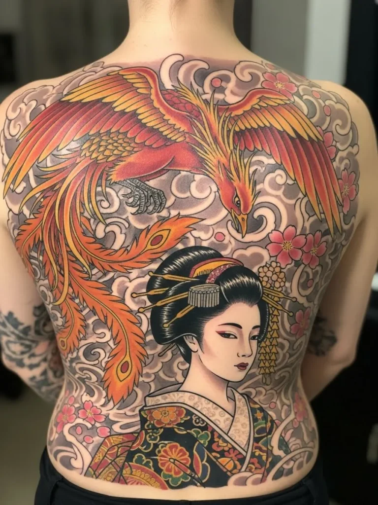 This stunning back piece combines a geisha with a phoenix, a symbol of rebirth and transformation. The tattoo spans the entire back, with the geisha depicted in intricate detail, surrounded by vibrant oranges, reds, and yellows that form the phoenix’s wings and feathers. The swirling clouds and peonies in the background complete the composition, creating a harmonious blend of elements. The tattoo is both bold and graceful, making a dramatic statement.